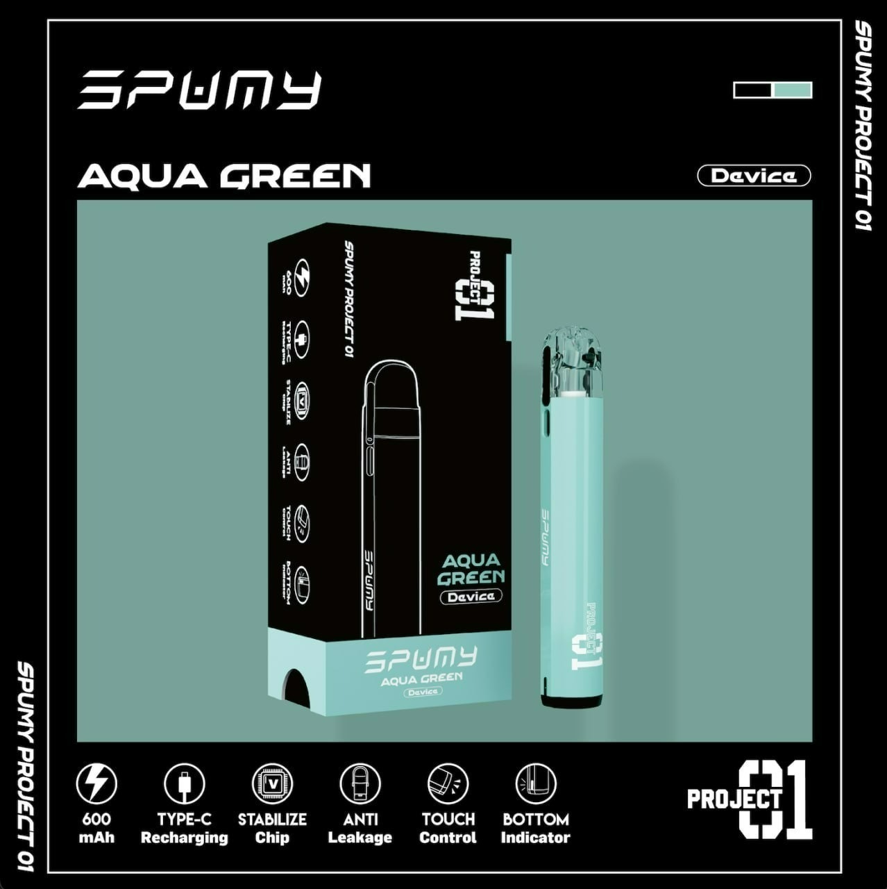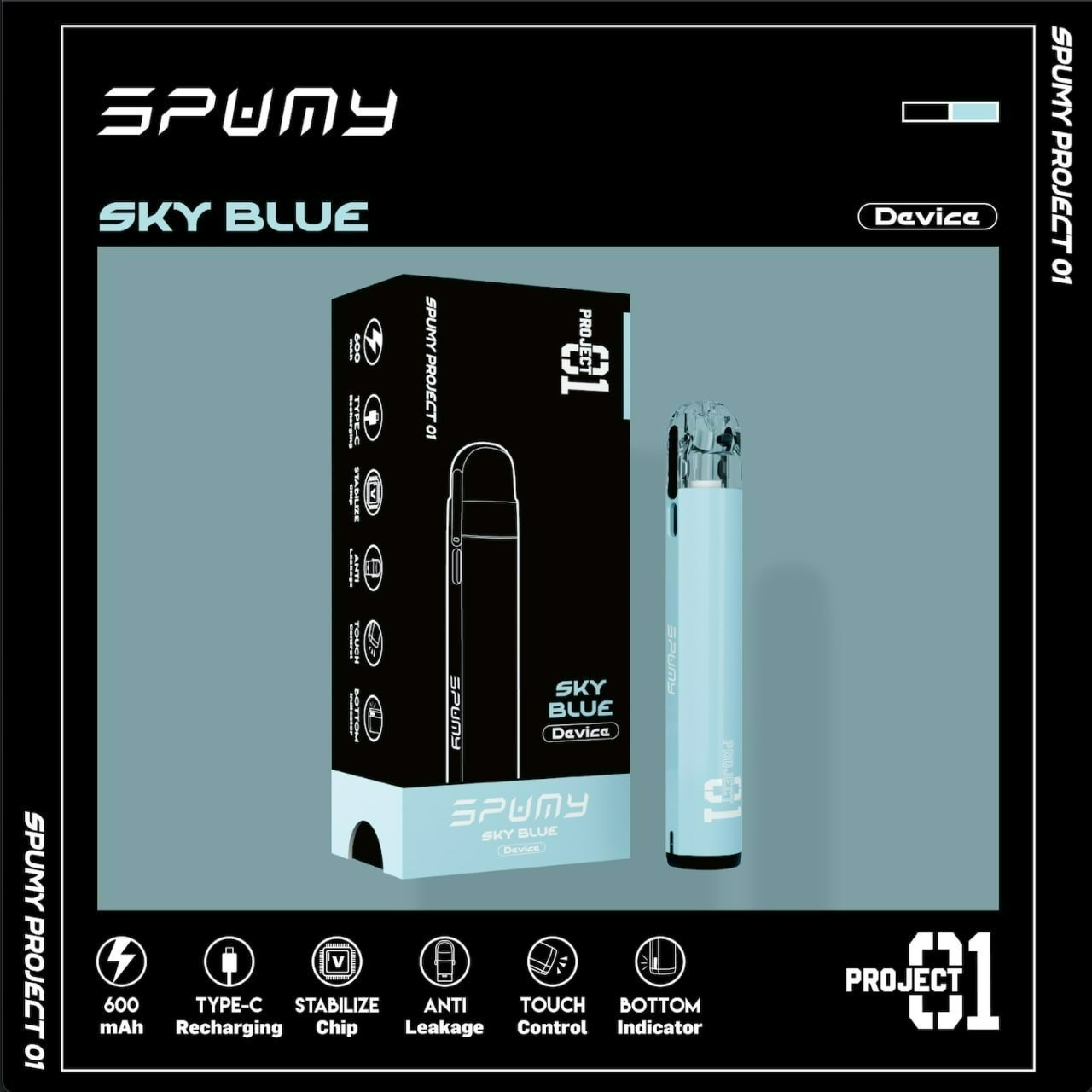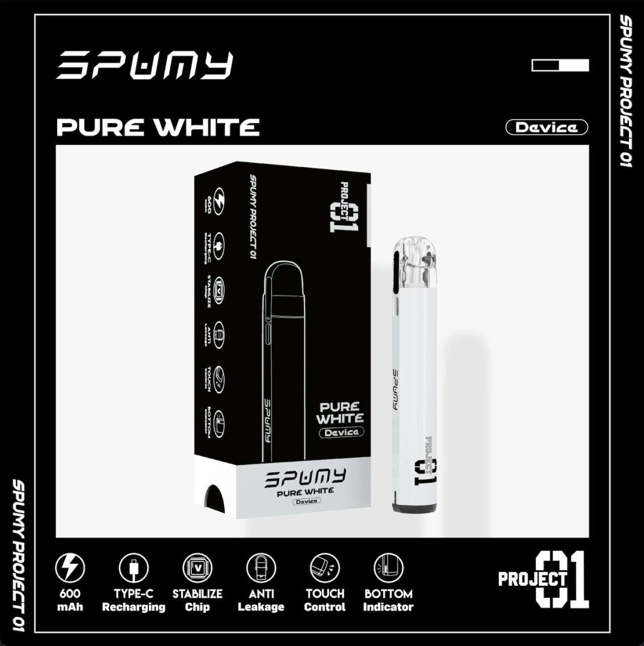 Project 01的命名來源於Spumy旗下首款開放式注油設備,在小煙主機以及一次性快消商品充斥市場的現今,自果汁起家的Spumy決定回歸初心,將產品的焦點著重於果汁以及設備的匹配性。非黑即白-翻玩「黑」與「白」「Either Black Or White 非黑即白」— 是Project 01最為核心的設計理念,外型上主打簡約風格,不需要花俏、多餘的設計,讓主機回歸到最純粹的樣式,並搭配亙古不退流行的「黑」與「白」,就是要你百搭。回歸本質,不忘初心